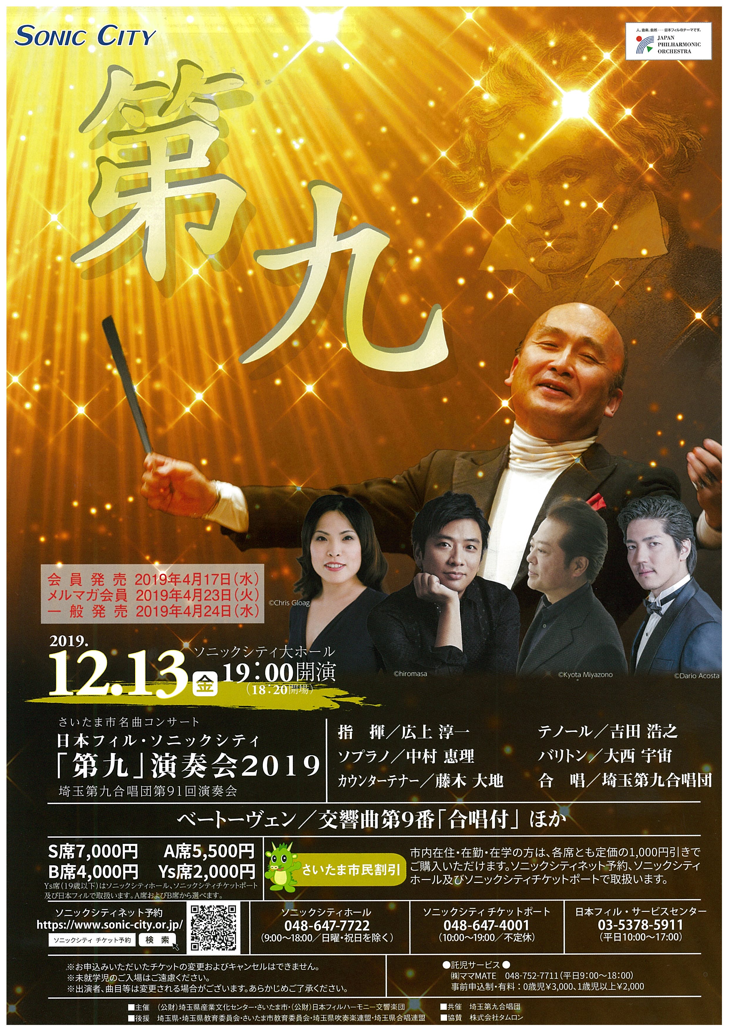 日 時 2019年12月13日(金)19:00 場 所 大宮ソニックシティ大ホール 曲 目 ベートーヴェン作曲/交響曲第9番 演奏者 指揮 広上淳一 日本フィルハーモニー交響楽団 S中村恵理 A藤木大地(カウンターテナー) T吉田浩之 B大西宇宙 録音 |