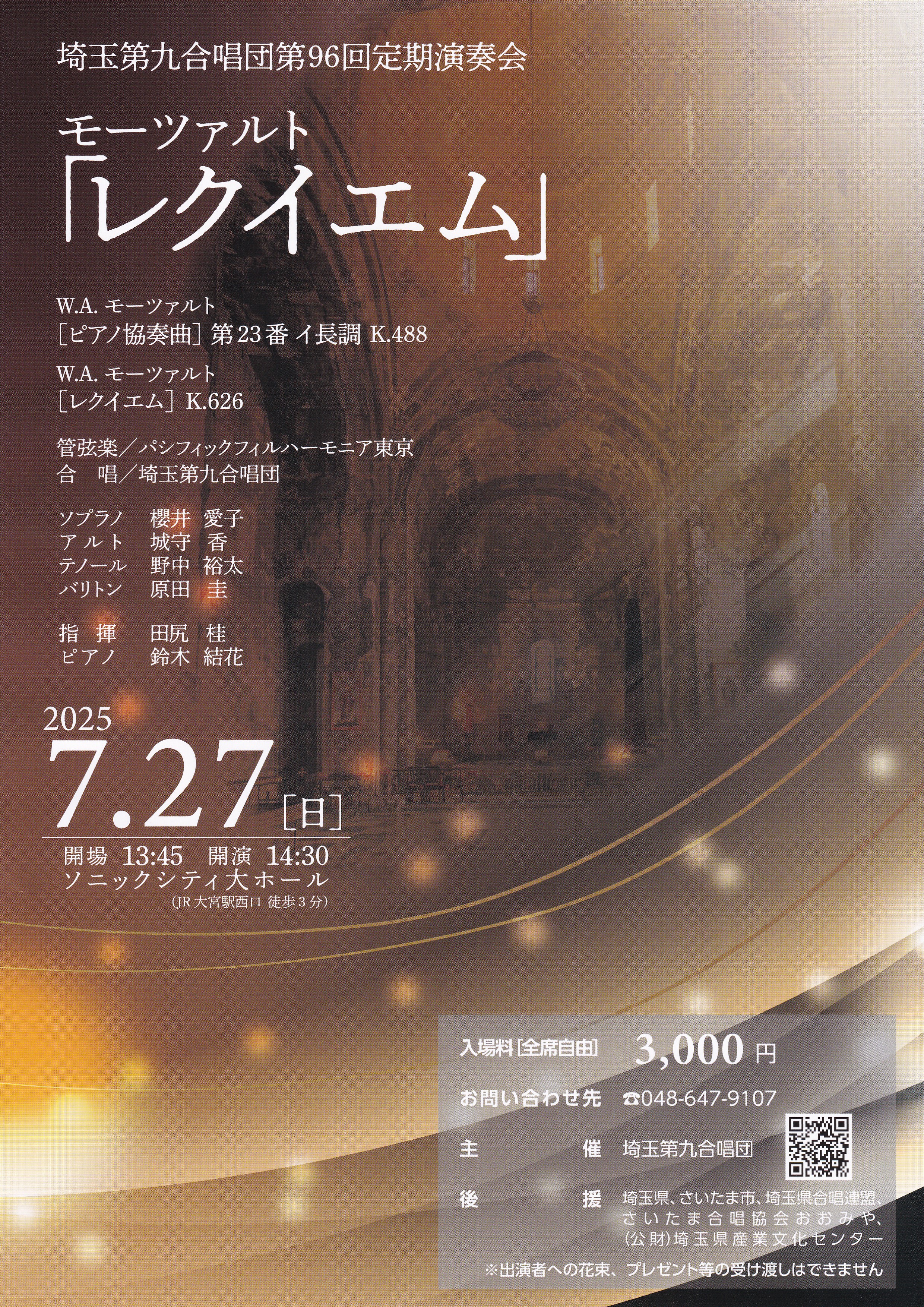 日 時 2025年7月27日(日)14:30開演 場 所 大宮ソニックシティ大ホール 曲 目 モーツァルト作曲/レクイエム 全曲 演奏者 指揮 田尻 桂 パシフィックフィルハーモニア東京 S櫻井愛子 A城守 香 T野中裕太 B原田 圭 オルガン鈴木結花 録 音 作成中 |